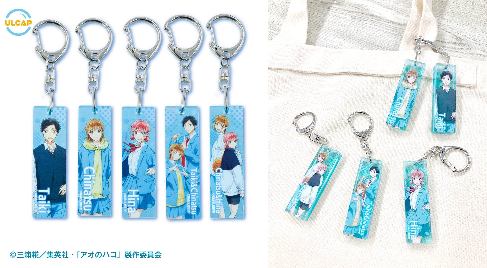 三浦糀原作の青春部活ラブストーリーで、2024年10月より放送開始のTVアニメ『アオのハコ』より、透き通るような青色が魅力的な「アクリルバーキーホルダー」がカプセルトイに登場。「猪股大喜」、「鹿野千夏」、「蝶野雛」、「猪股大喜&鹿野千夏」、「鹿野千夏&蝶野雛」のイラストとネーム入りデザイン全5種類を展開いたします。