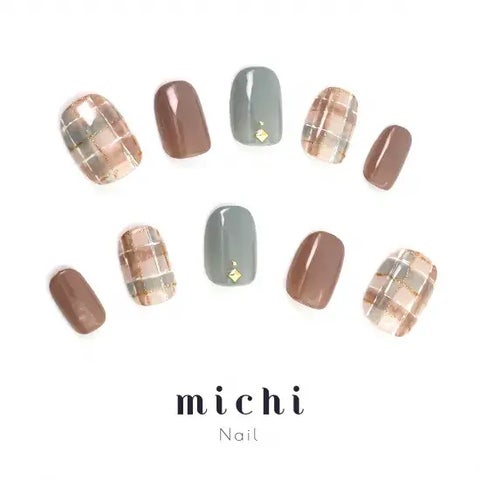 ベージュブラウンとアイスグレーを基調に、チェック柄とゴールドラインをアクセントにした秋らしいネイル。さりげないゴールドスタッズが上品さを引き立てる、大人可愛いデザインです。