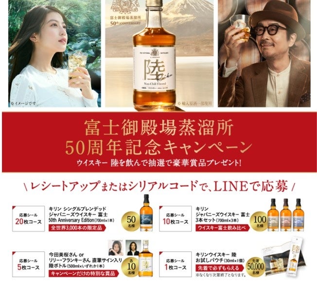「陸」を飲用あるいは購入いただいたお客様にキャンペーンシールをLINEで付与し、貯まったシールのポイントに応じて、抽選で富士御殿場蒸溜所50周年に関連した賞品が当たる。