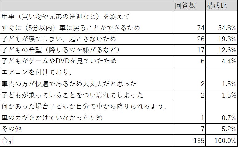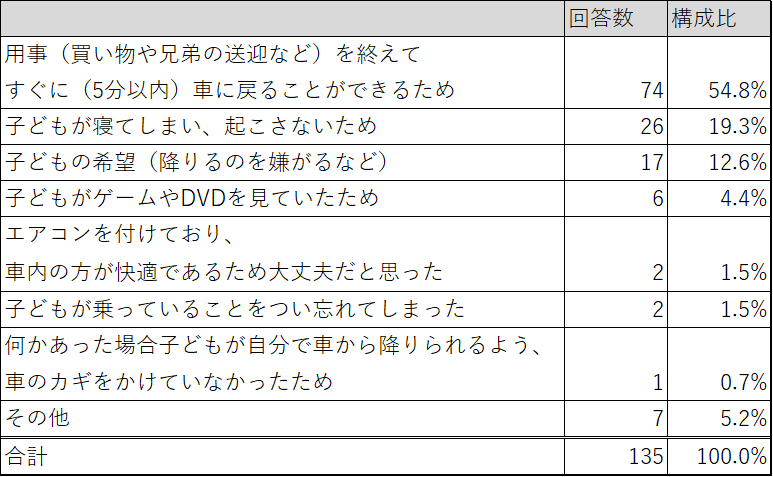 同居に関わらず家族に12歳以下の子どものいる方246名に「時間の長さに関わらず、少しの時間であっても子どもを車内に残したまま車を離れたことがありますか?」とうかがったところ、54.9%の方が「ある」と回答。最も多かった理由は「用事(買い物や兄弟の送迎など)を終えてすぐに(5分以内)車に戻ることができるため(54.8%)」でした。