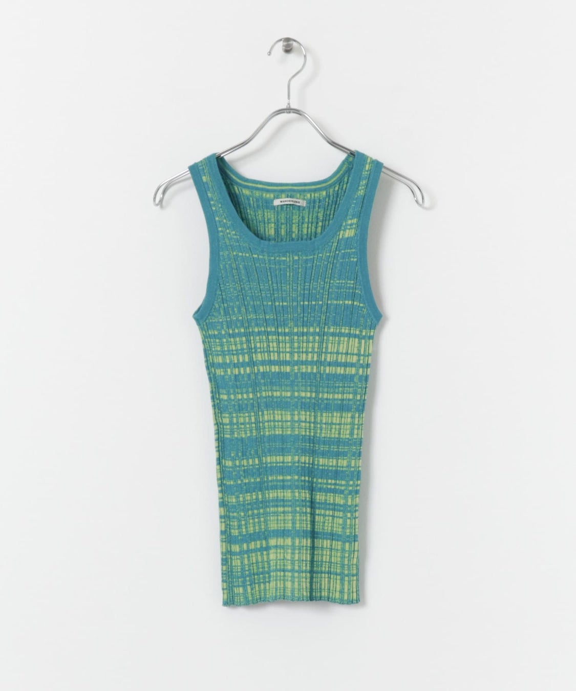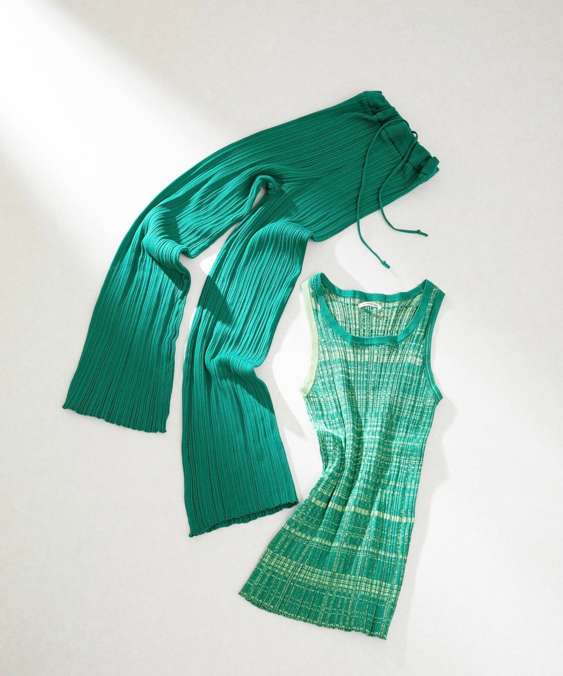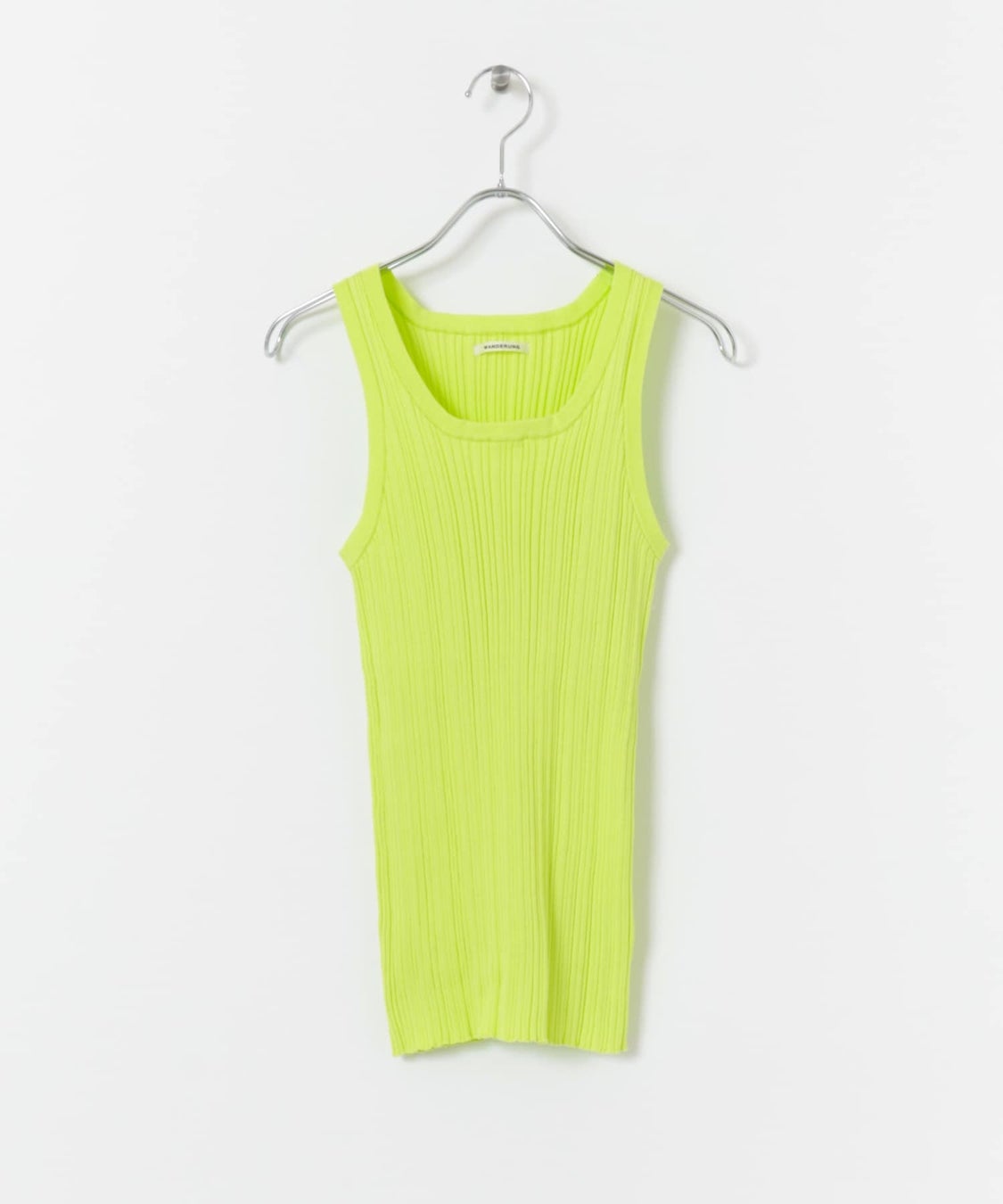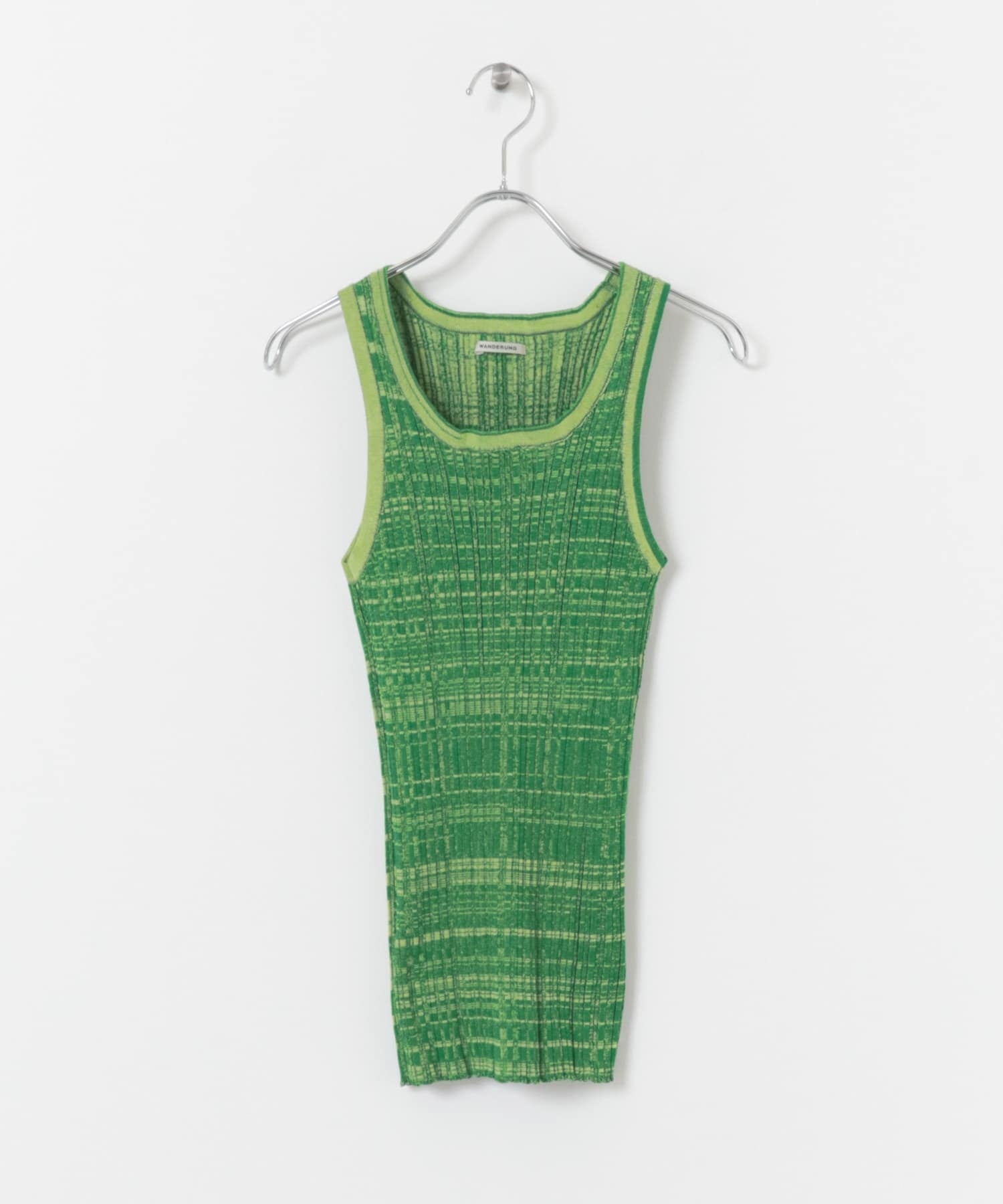 今シーズン WANDERUNG で登場するリブニットシリーズのタンクトップとパンツに、 鮮やかなグリーンカラーを別注させていただきました。