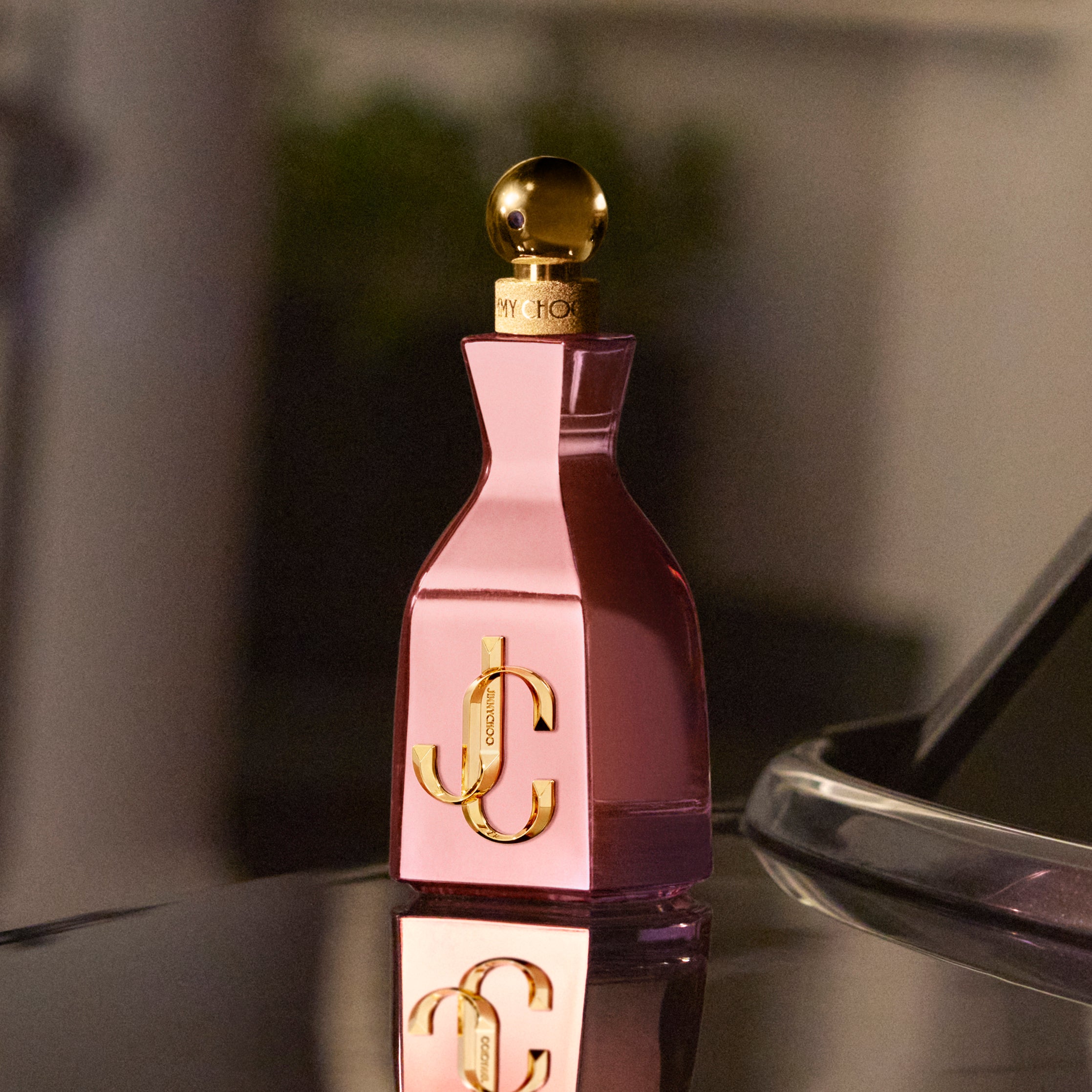 透け感のあるメタリックピンク加工を施したガラスボトルは、きらめく鏡のようにフェミニンな表情で仕上げられ、「アイ・ウォント・チュウ」コレクションの華やかでエレガントな美学を継承。
