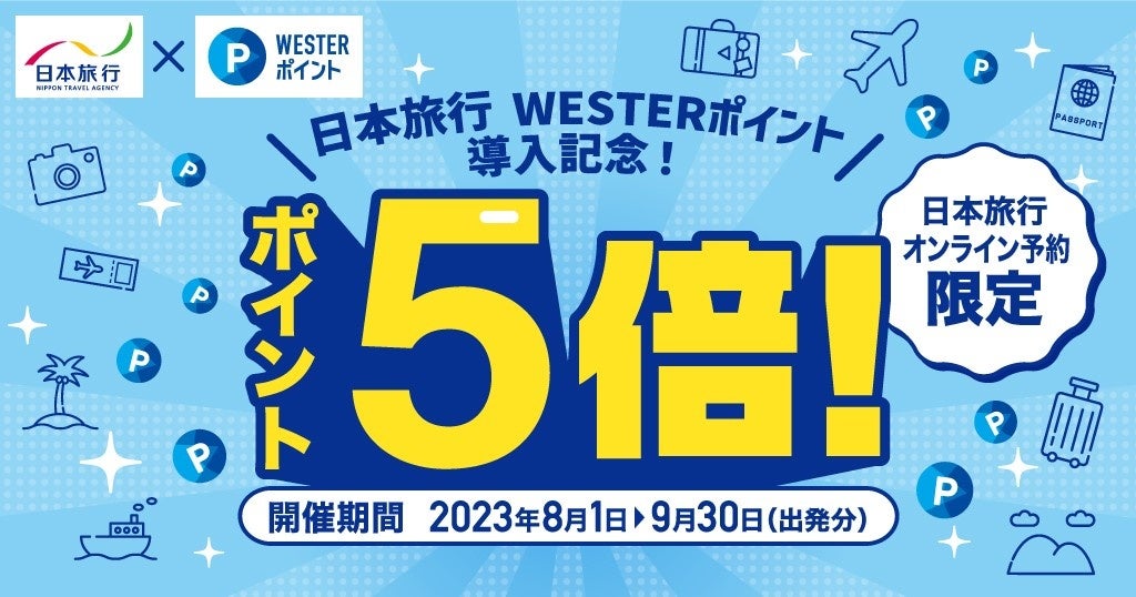 株式会社日本旅行(本社:東京都中央区、代表取締役社長:小谷野 悦光)は、2023年7月25日(火)より、JR 西日本グループ共通のポイントサービス「WESTERポイント」を、西日本エリアの22のTiS店舗、および、JRおでかけネット内の日本旅行ページ経由でのオンライン予約を対象に開始します。ご予約いただいた旅行代金110円(税込)につき1ポイントがたまり、たまったポイントは1ポイント1円でつかえます。この度、WESTERポイント開始を記念して、多くのお客様にご利用いただくため、ポイントアップキャンペーンを開催します。