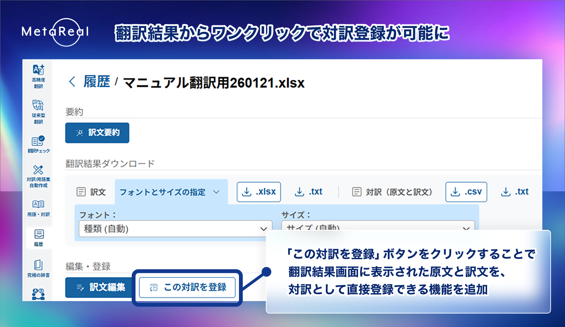 ~翻訳結果からワンクリックで対訳登録が可能に~