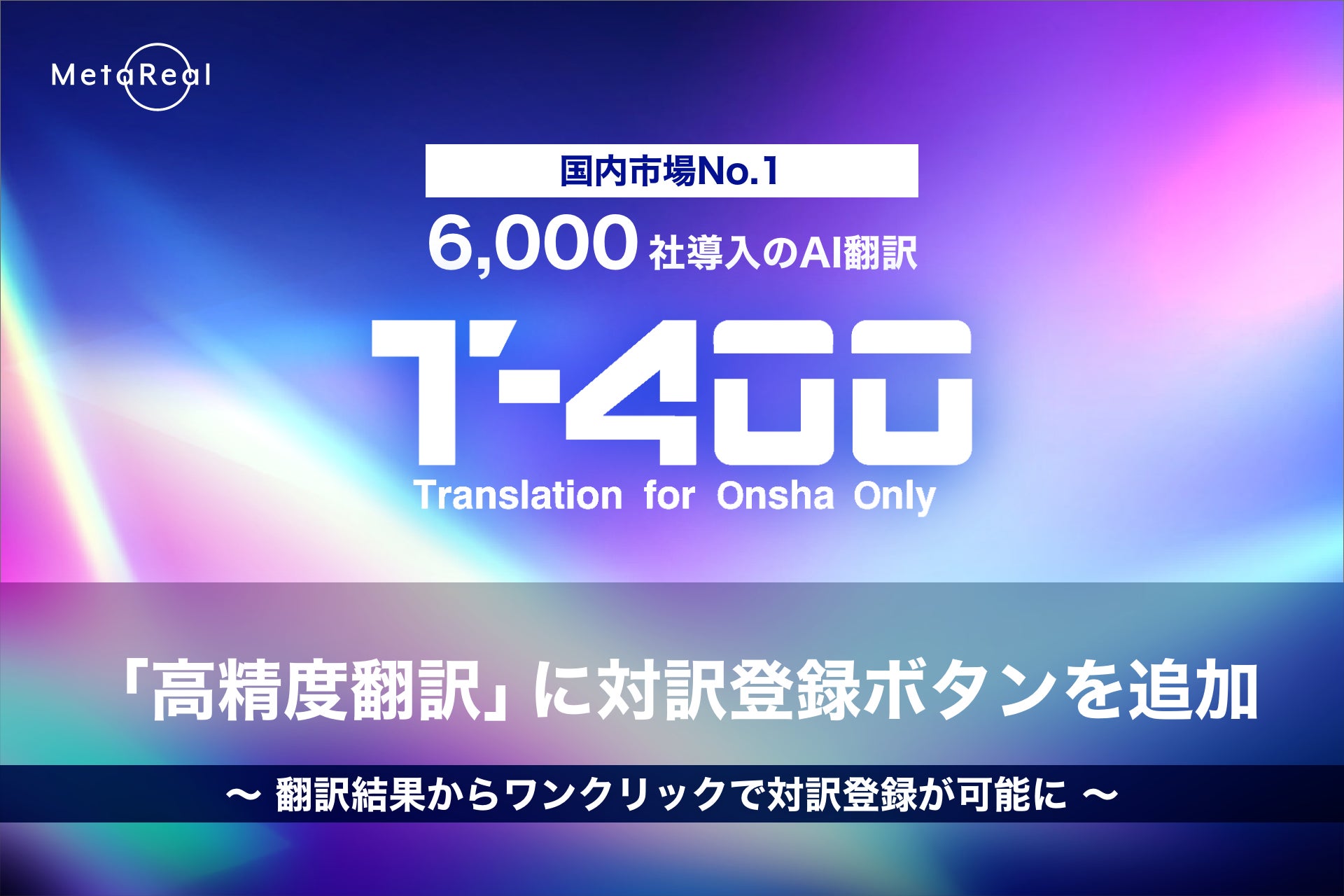 株式会社メタリアルグループで、国内市場No.1※のAI翻訳サービスを開発・提供する株式会社ロゼッタ(代表取締役:五石 順一)は、2026年2月、高精度産業翻訳AI「T-4OO(ティーフォーオーオー)」において、「高精度翻訳」の翻訳結果画面に「この対訳を登録」ボタンを追加したことをお知らせします。