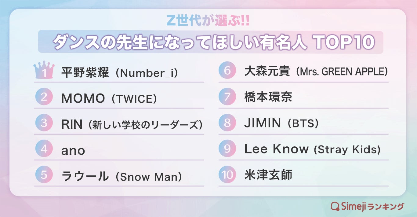 【Simejiランキング】Z世代が選ぶ!!「ダンスの先生になってほしい有名人TOP10」