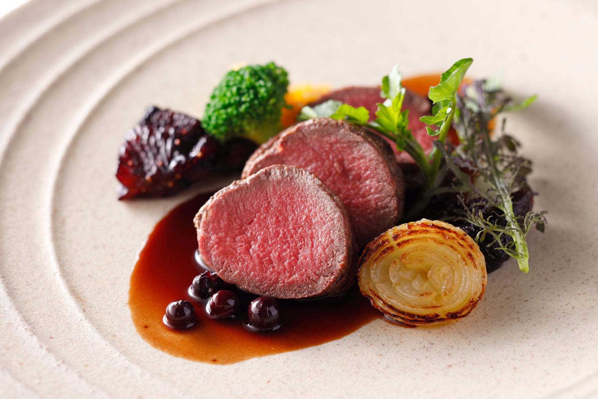 肉料理の『蝦夷鹿のローストとそのジュのソース』は、蝦夷鹿の美味しさを余すことなく味わえるひと皿です。