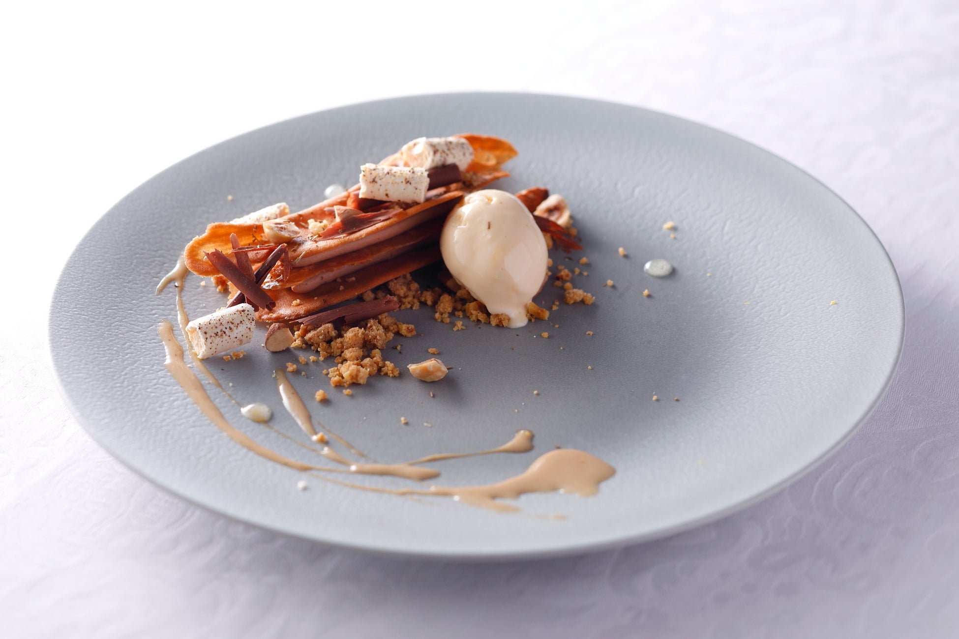 コースの最後を飾る『ほうじ茶のガナッシュ ゆずミルクジェラート』は、秋の森から着想を得たデザートです。ナッツやメレンゲ、クランブルなどザクザクとした食感が楽しめる食材を使い、森の中で落ち葉や枝を踏んだ時の感覚を表現しています。ほうじ茶のガナッシュやゆずのアイスクリームが、優しく秋らしい味わいです。香ばしいほうじ茶の香りと、秋の食材が織りなす食感をご堪能ください。