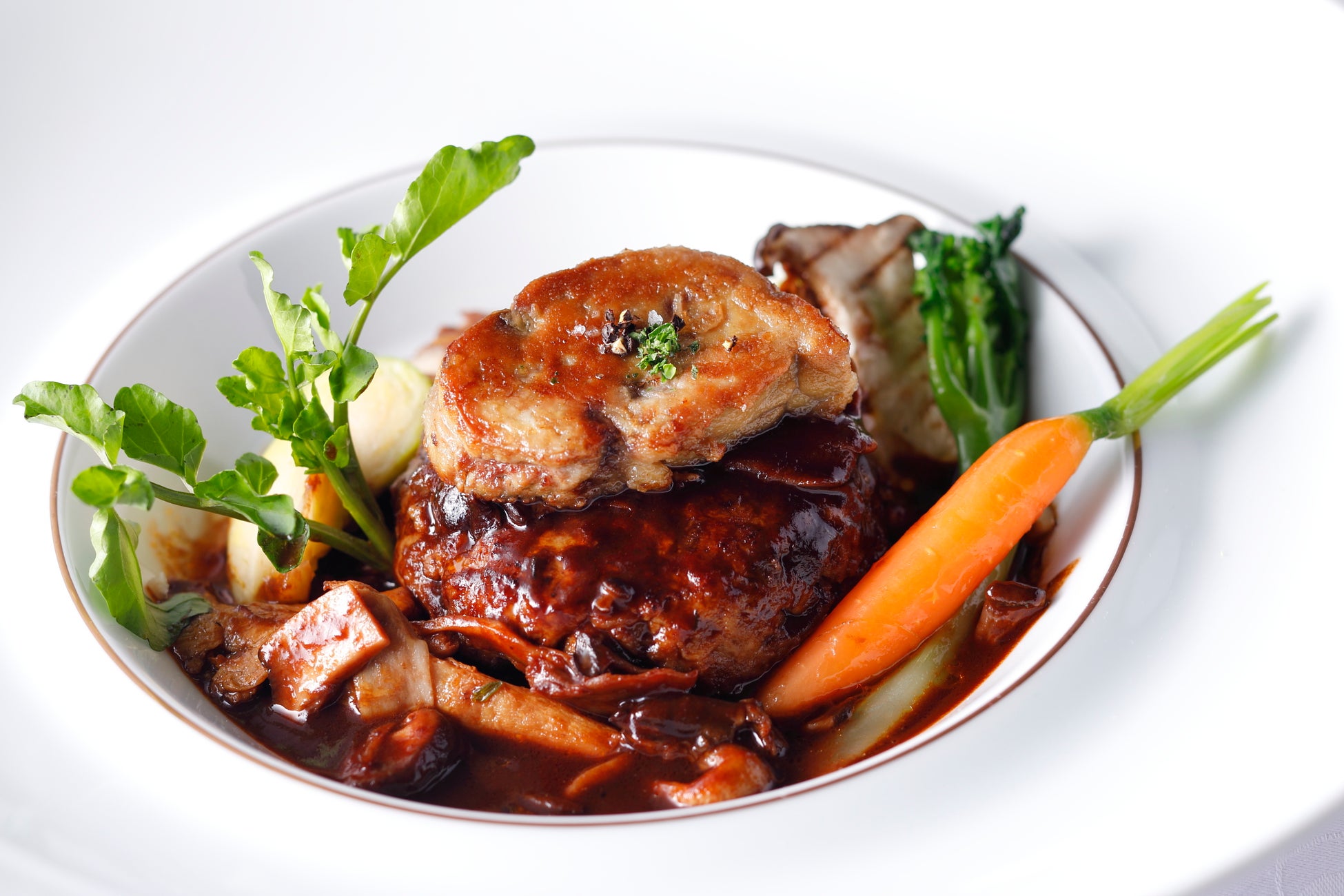 和牛を100%使ったハンバーグステーキに、食感を残して煮込んだ牛舌を混ぜ込み焼き上げました。アクセントとして牛舌の食感をお楽しみいただけます。ハンバーグステーキには季節の野菜とフォアグラを添えています。濃厚なジロール茸の赤ワインソースと、和牛の上質な味わいをご堪能ください。