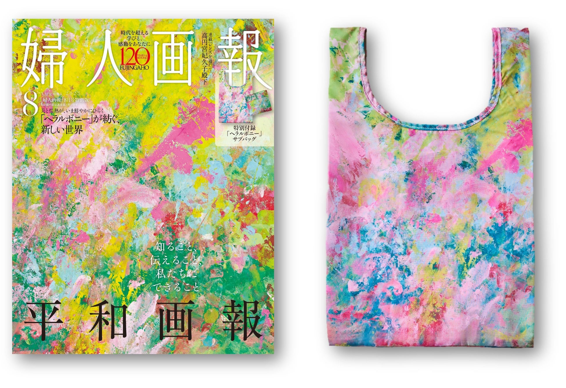 創刊120周年を迎えた『婦人画報』8月号では、記念号にふさわしい特別な意匠として、「ヘラルボニー」の契約作家である鈴木広大氏による色彩豊かなアート作品を、雑誌の表紙と特別付録のサブバッグにいたしました。鮮やかに広がる色の重なりは、希望や“平和”への祈りを想起させます。日常の中でアートを身にまとうように楽しめる、婦人画報オリジナルのサブバッグです。表紙と同じ絵柄を用いたサブバッグは、持ち歩くたびに平和への思いを呼び起こします。アートの力とともに、「知ること、伝えること、『平和』のために、私たちができること」を未来へとつなぐ特別号をぜひご覧ください。