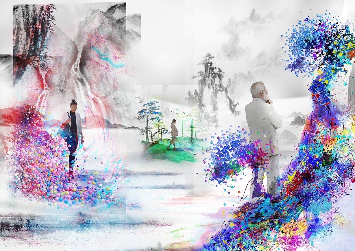 茶室の床の間に飾られる重要な芸術品として発展し、日本人の精神、魂を形成する芸術作品である掛け軸。床の間に掛けられた掛軸の絵画の中の世界に入っていくと、奥には水墨画の世界が広がる。水墨画の絵画の作品の中に入り込むイマーシブアート作品。