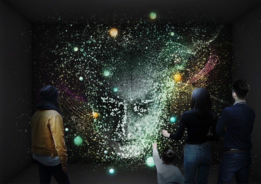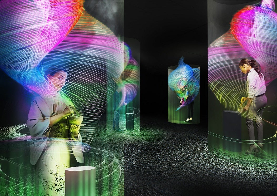 茶室という小宇宙で、居合わせた人たちの「一期一会」から生まれた「間」を可視化する現代ならではの茶室。茶室の中で亭主が茶を点て、客が体と息と心を整え、それが合わさった時に映像に現れるという、以心伝心や一期一会という茶室の精神を感じるアート作品。