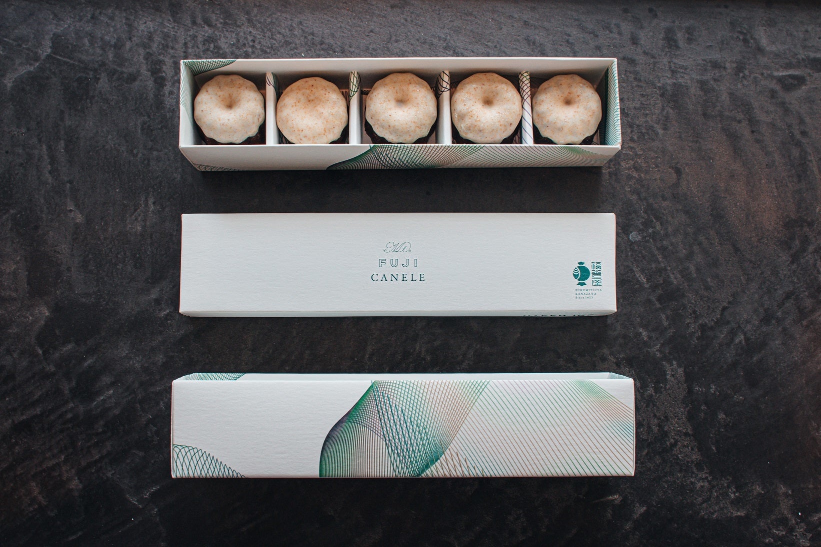 富士山カヌレは、本場フランス・ボルドー地方ではラム酒を使うカヌレを生地に、金沢最古の酒蔵「福光屋」の新鮮な酒粕を練り込むことで、日本風に再構築。しっとり、そしてむっちりとした食感。ふんわりと酒の風味が漂い、ホワイトチョコレートの甘みとキャラメルのようなコクを感じさせます。