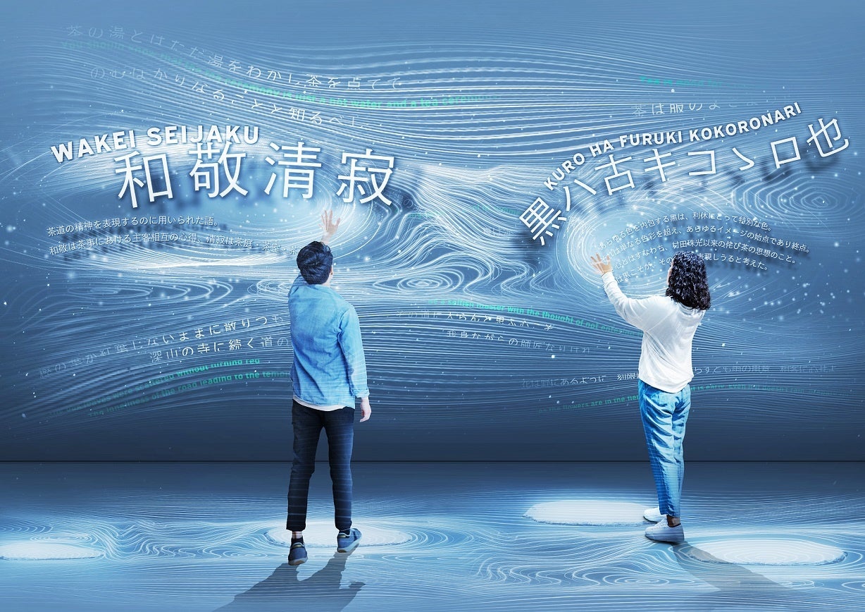 利休が残したことばの川。枯山水は水が流れる風景を表現した庭園で、渦巻きの模様は悟りや心理、世界観や宇宙観も表す。茶の湯の心をあらわすことばが、美しい枯山水となって壁面や空間に描かれ、そのことばから利休の精神性や想いを体感する作品。