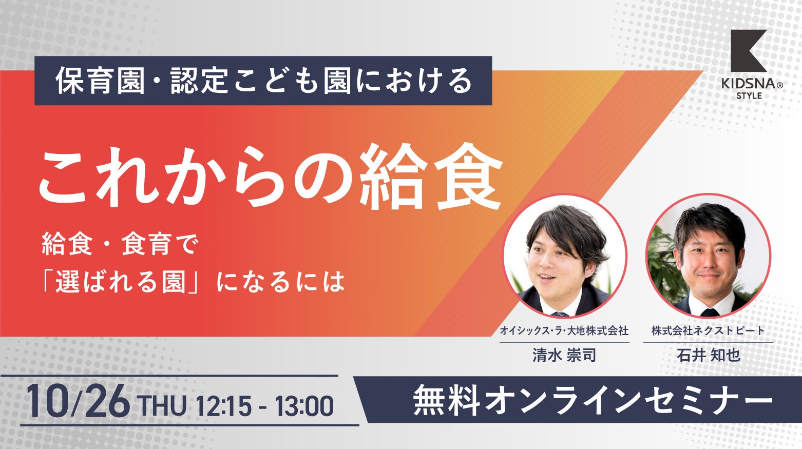 【10/26(木)無料オンラインセミナー】株式会社ネクストビート主催「保育園・認定こども園におけるこれからの給食 ~給食・食育で『選ばれる園』になるには~」