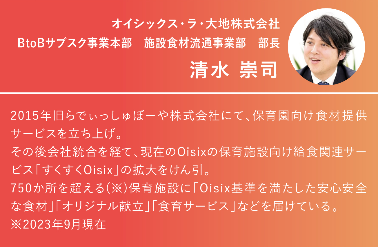 (登壇者:オイシックス・ラ・大地株式会社 BtoBサブスクリプション事業本部 施設食材流通事業部 部長 清水 崇司)