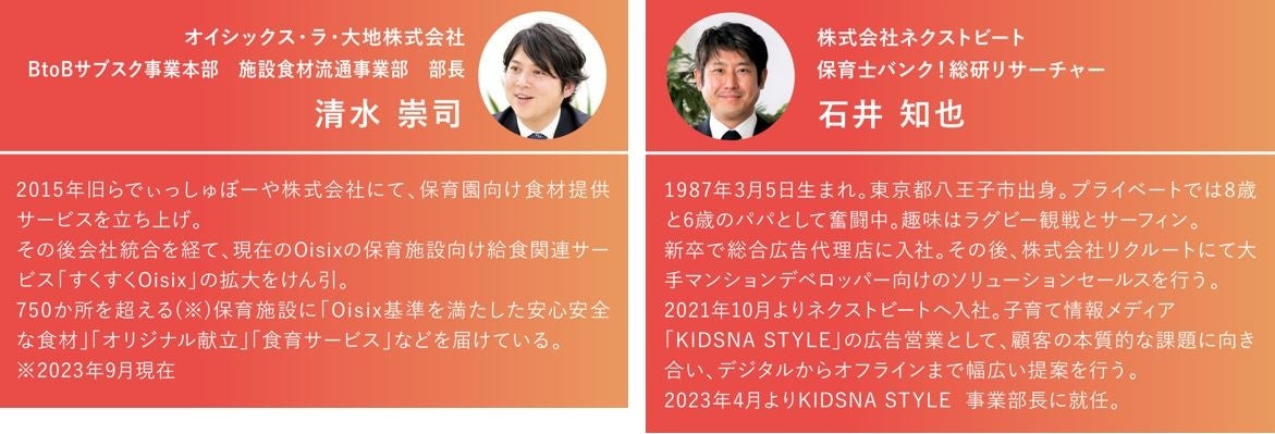当社のBtoBサブスク事業本部 施設食材流通事業部 部長の清水崇司が「保育園・認定こども園における『これからの給食』」について事例と共に紹介。また、子育て情報メディア「KIDSNA STYLE」の事業部長 石井和也氏が 保育業界全体や保育士の労働実態などのリサーチに基づき、「待機児童解消時代の保育園に何が求められているのか」について紹介します。