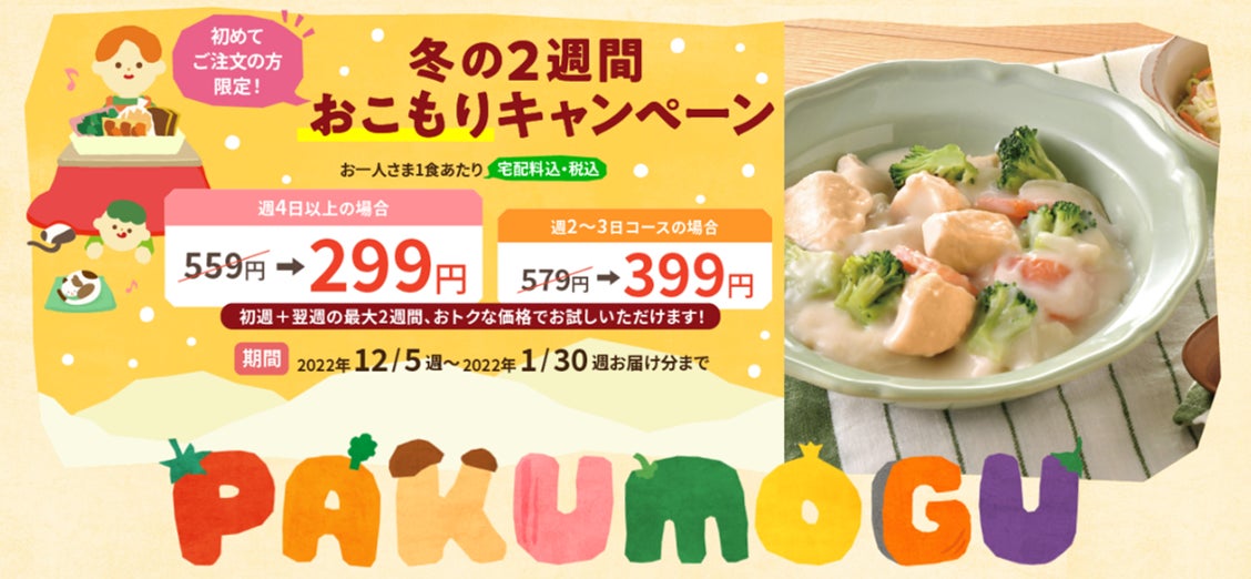 これから「PAKU MOGU」を始める方は、週4日以上のご注文でお一人さま1食あたり299円よりご注文できる「冬の2週間おこもりキャンペーン」をご利用いただけます。