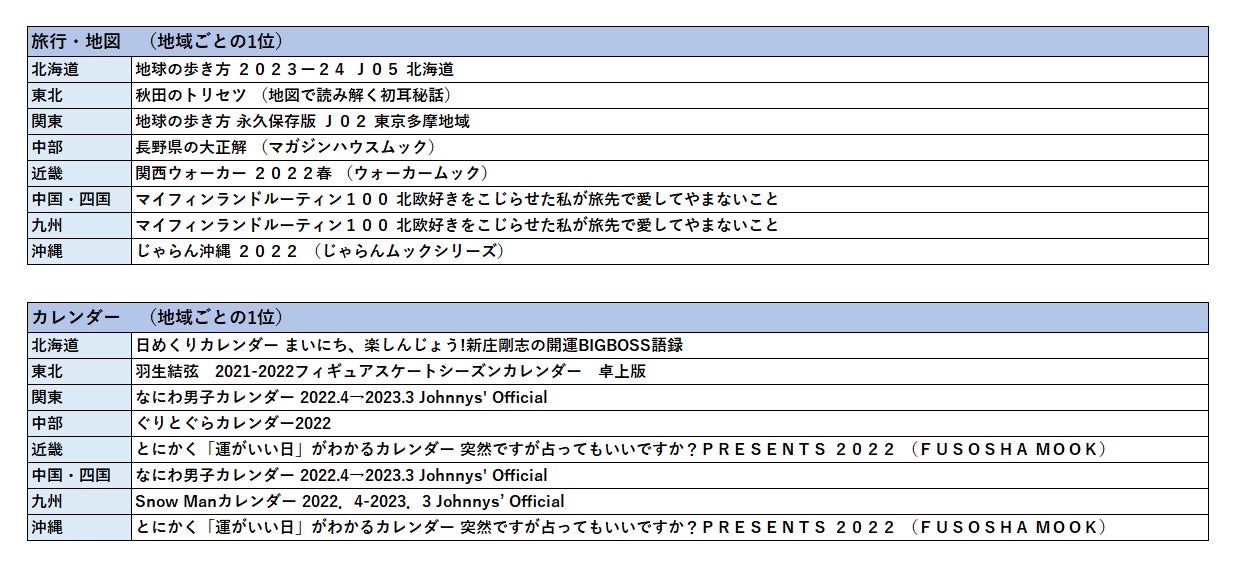 また、ジャンル「カレンダー」では『日めくりカレンダー まいにち、楽しんじょう!新庄剛志の開運BIGBOSS語録』(北海道)、『羽生結弦 2021-2022フィギュアスケートシーズンカレンダー 卓上版』(東北)などが1位を獲得しており、地域ゆかりの強さが見て取れます。「カレンダー」は北海道と沖縄を除くすべての地域で『なにわ男子カレンダー 2022.4→2023.3 Johnnys' Official』がトップ5中にランクインしており、人気の高さがうかがえる結果となりました。