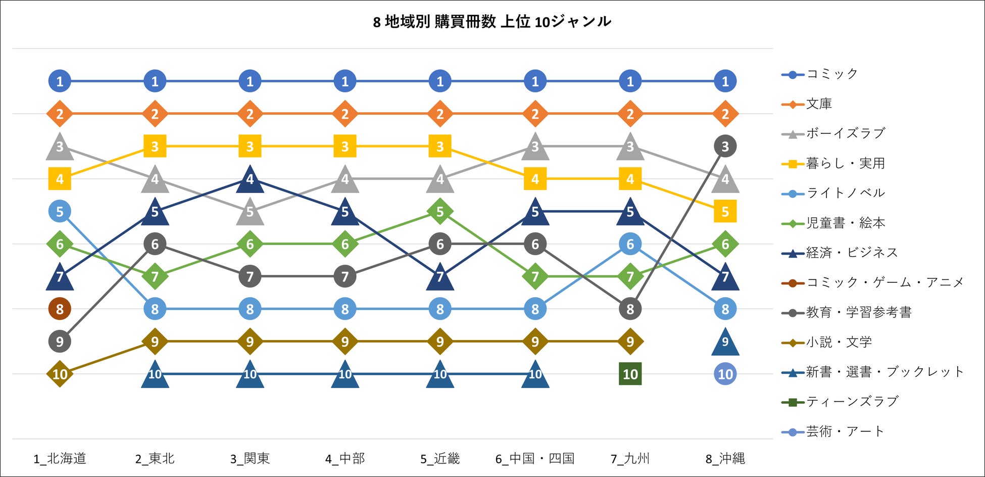 3位以降は各地域で順位に変化が見られます。沖縄は他地域では5位以下に位置している「教育・学習参考書」が3位に入っています。北海道は5位に「ライトノベル」、近畿は5位に「児童書・絵本」が入りました。