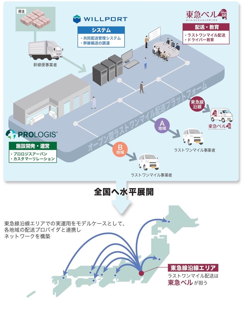 ラストワンマイル配送の需要拡大に対して、配送の担い手が不足している問題を解決する取り組みであり、ラストワンマイル拠点の整備・運営ノウハウの提供をプロロジスが行い、ウィルポートが開発・提供する共同輸配送管理システムを利用し、配送拠点は、東急の既存拠点を活用するほか、「東急ベル」のベルキャストが配送を担うという一連のサービスをパッケージ化するものです。