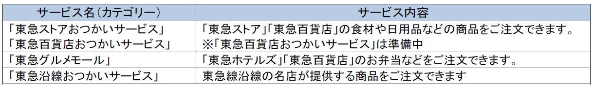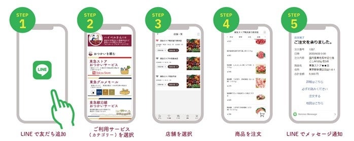 食材、日用品に加え、百貨店やホテルの高級弁当、東急線沿線の名店が提供する商品を東急ベルがお客さまに代わって「おつかい」するサービスです。LINEミニアプリ上でご注文時の用途やエリアから店舗を選択し、ご希望の商品をご注文、店舗で商品を用意した商品を東急ベルの配送員(以下、ベルキャスト)がお届けに伺います。