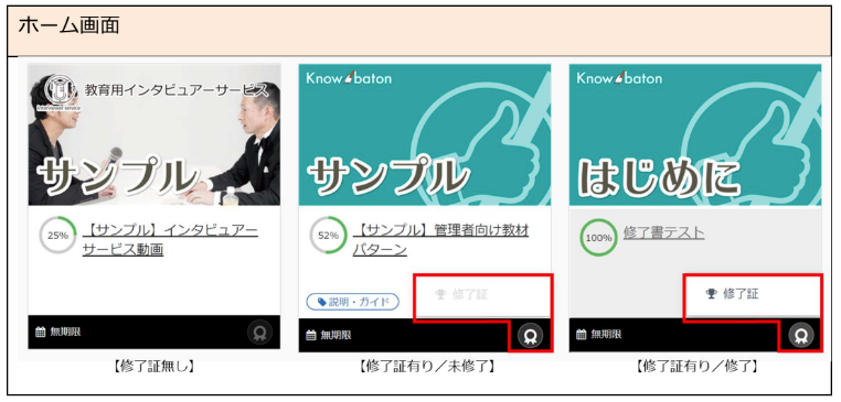 ホーム画面にて、各コースを修了した際に表示させる修了証の機能を追加しました。いままではオプションの「デジタル・バッジ」でのみ利用可能となっていましたが、今回修了書の設定機能を標準搭載しました。修了証は「修了証テンプレート設定」機能にて追加した PDF ならびに PDF 上に追加した情報(タイトル、本文、フッター、ID、氏名、クラス名、教科名、修了日、修了証番号)を表示することが可能です。