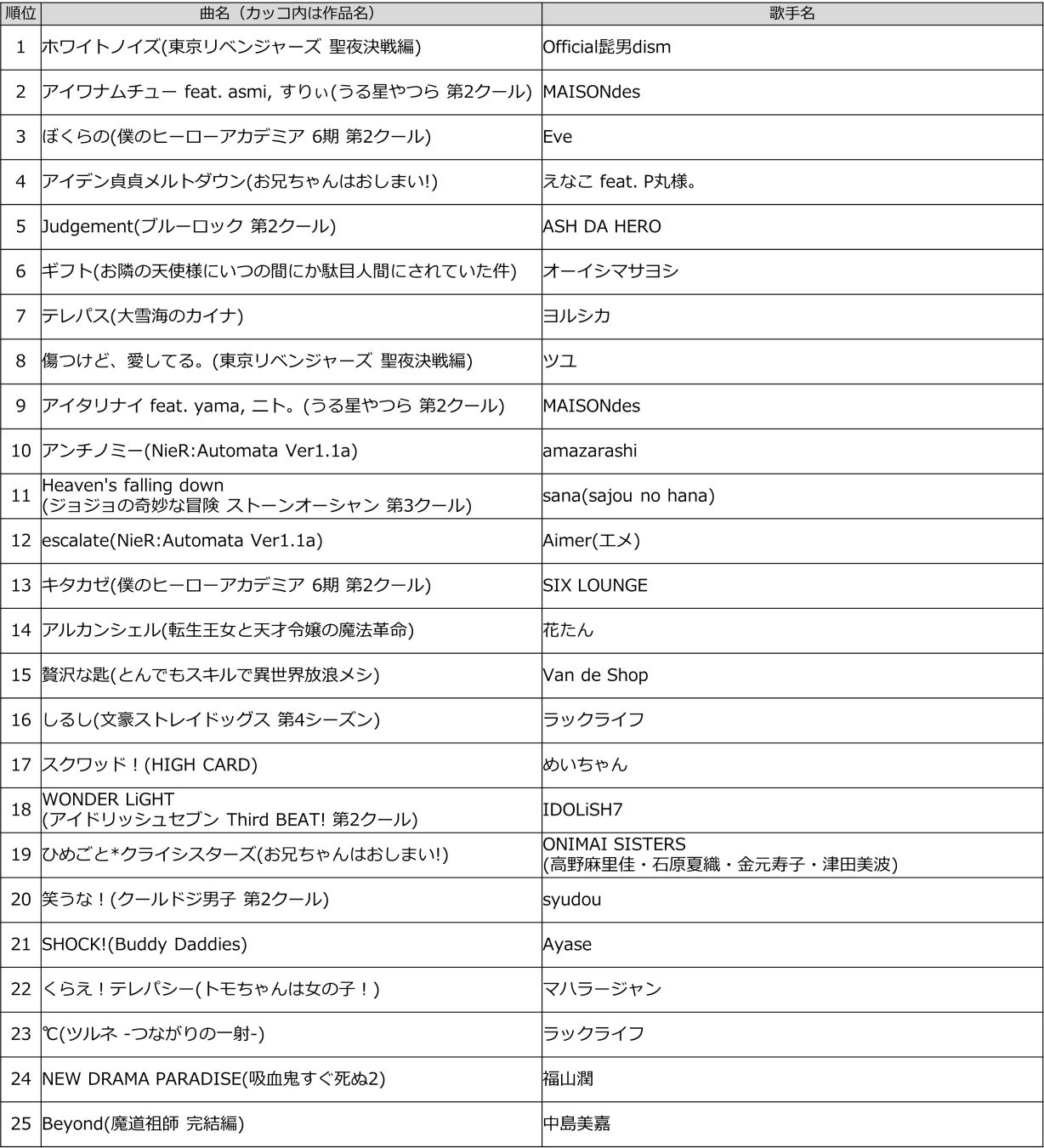 * 放送が期をまたぐ作品で楽曲が前期と同じ場合は対象外となります。