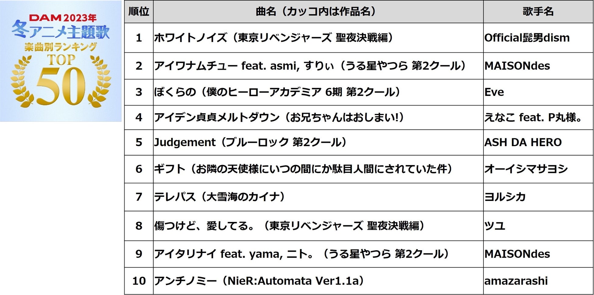 - 通信カラオケDAM 2023年冬アニメ主題歌 カラオケランキング TOP50