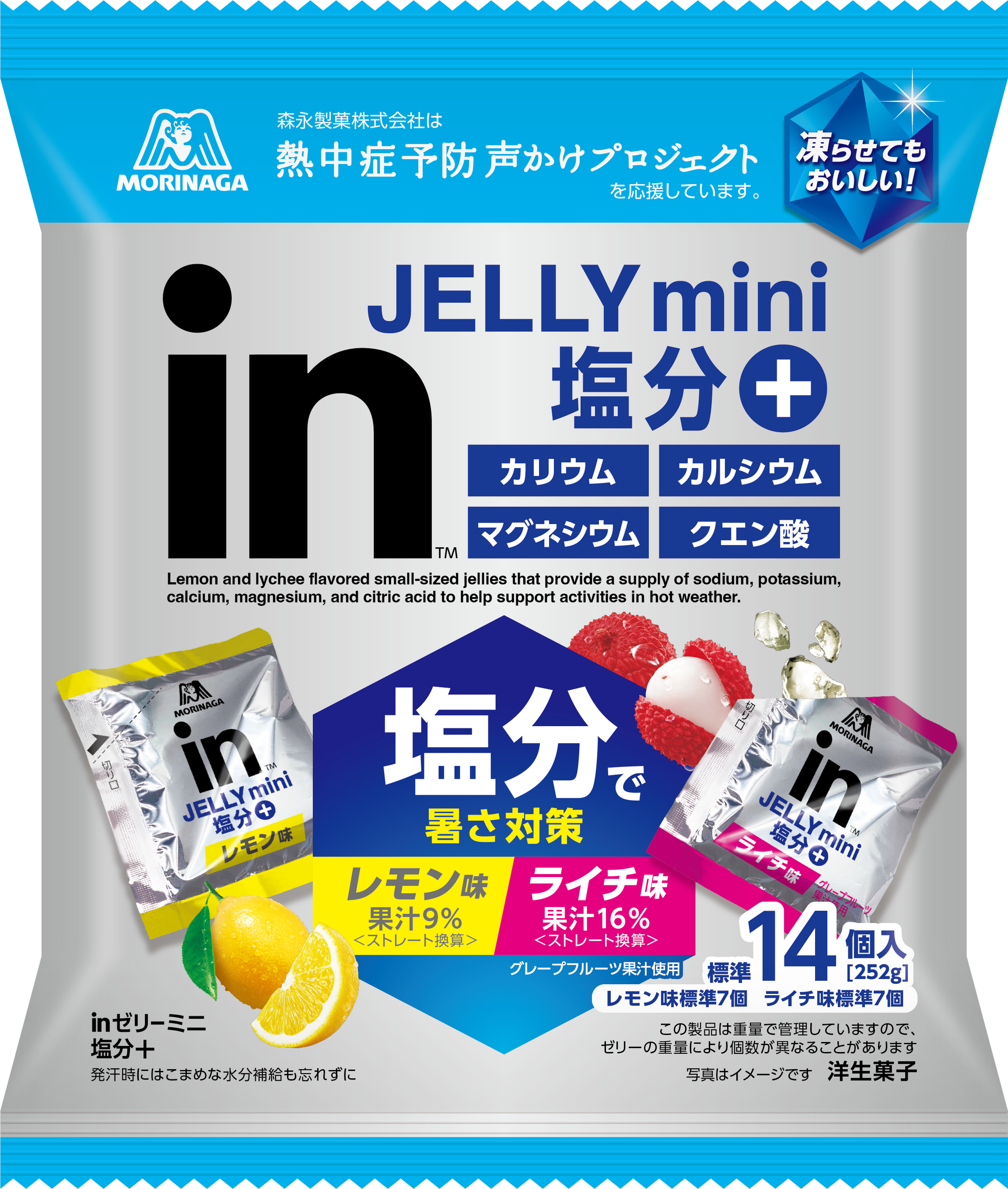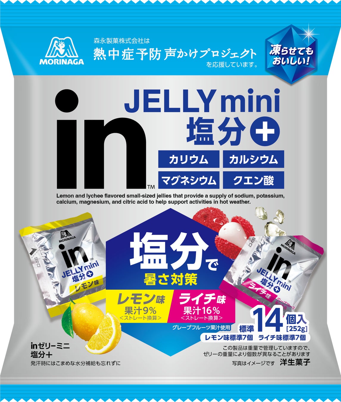 「inゼリー ミニ 塩分+」は、手軽に塩分を摂取できるひとくちタイプのゼリーで、塩分に加えてミネラル3種(カリウム、カルシウム、マグネシウム)とクエン酸を配合しました。さらに、レモン味とライチ味のアソート(計14袋)で、気分に合わせて選べるおいしさと続けやすさも特長です。凍らせて食べることも可能です。