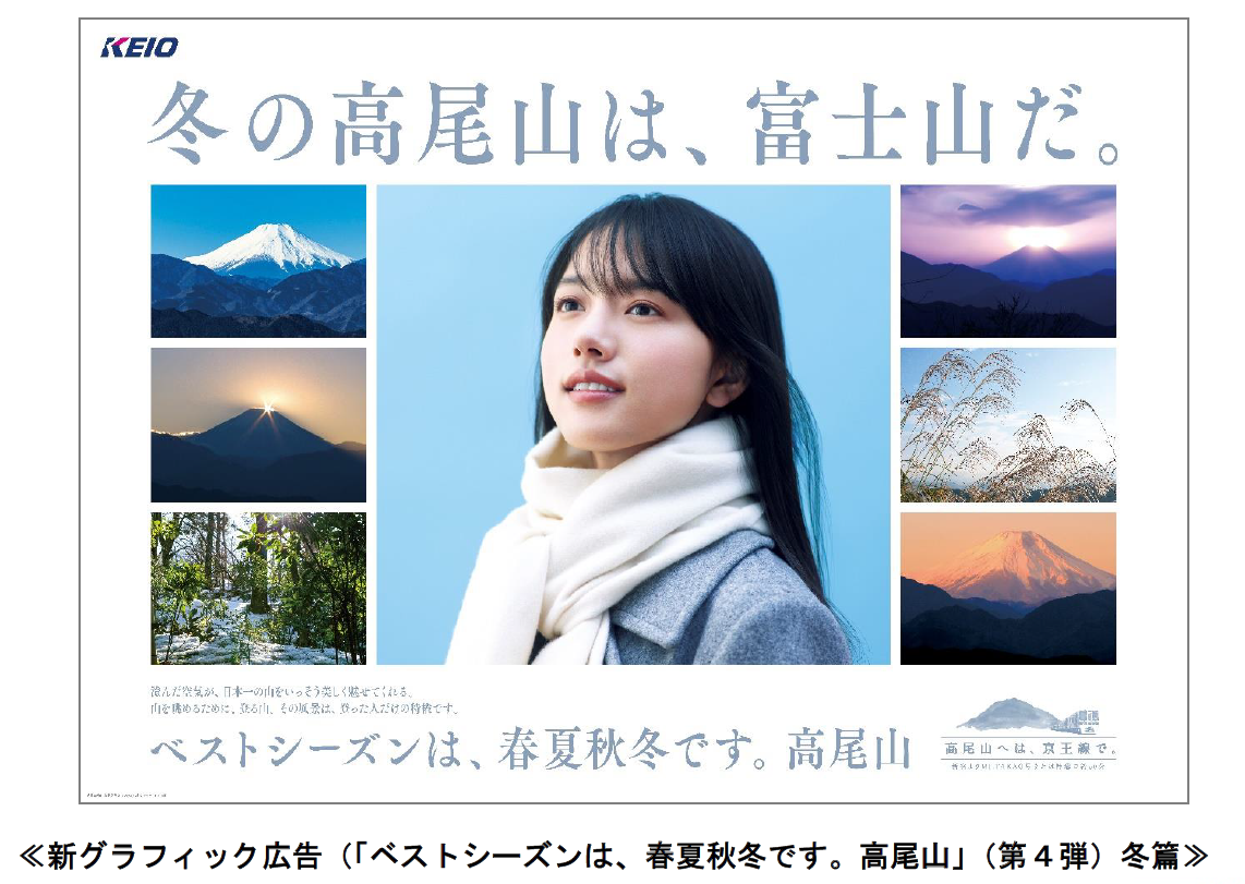 京王電鉄株式会社(本社:東京都多摩市、取締役社長:都村 智史)では、12月16日(金)から、女優の清原果耶さんを起用した、高尾山の美しい四季をPRするグラフィック広告「ベストシーズンは、春夏秋冬です。高尾山」篇の第4弾を、京王線・井の頭線の駅・列車内にて展開します。