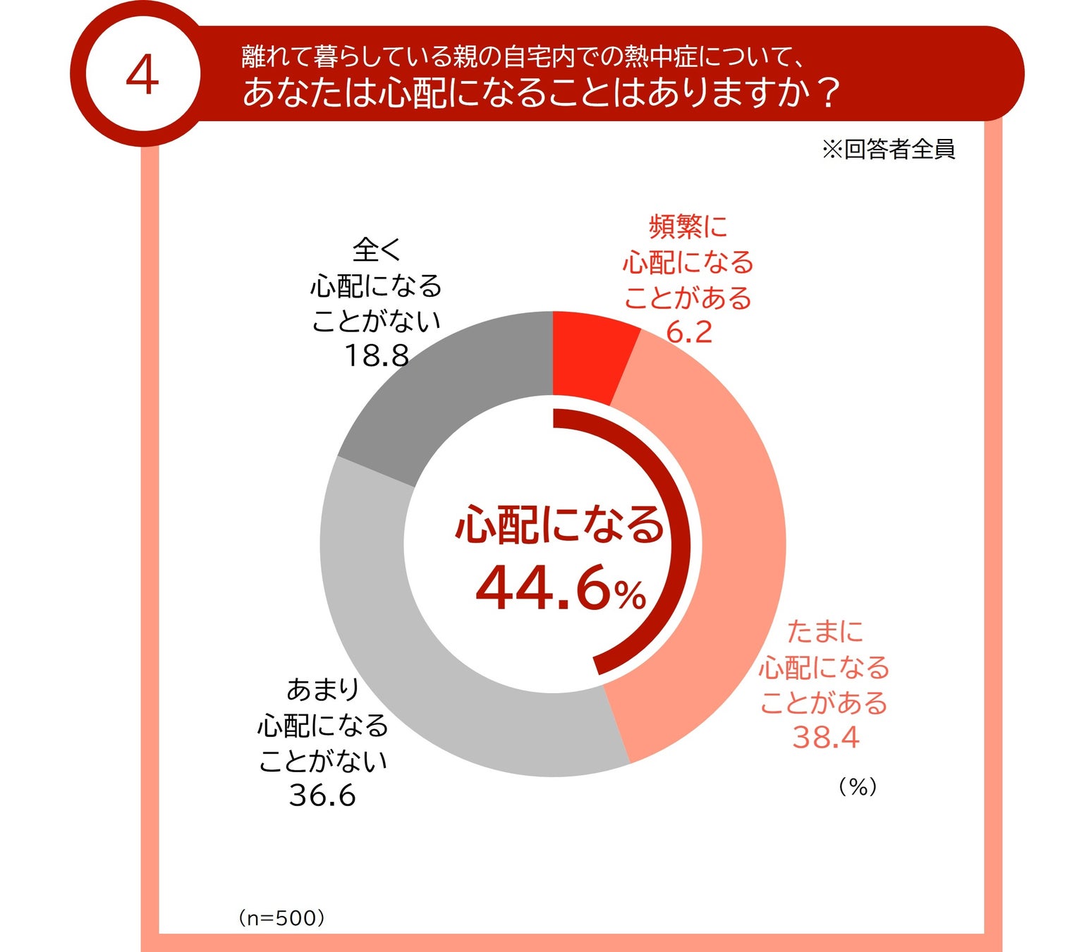 充実した迷惑電話防止機能やあんしん機能のほか、電話機親機が設置されている室内の温度や湿度をセンサーが検知し、熱中症警戒(※4)や乾燥警戒(※5)を音声(※6)と液晶ディスプレイの表示、着信お知らせLED(赤色)でお知らせしてくれる、「温度・湿度アラーム」を搭載したモデルをご紹介します。親と離れて暮らす中で「自宅内での熱中症」は、夏の心配事の一つです。実際に離れて暮らす親の自宅内での熱中症について尋ねたところ、44.6%と半数近い方が「心配になる」と回答しました。