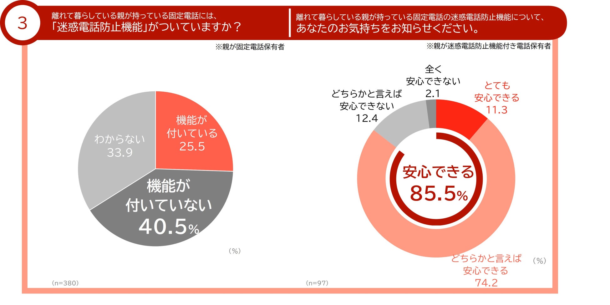 離れて暮らす親の固定電話について聞いたところ、「迷惑電話防止機能がついていない」と回答した方は40.5%となりました。一方で、親が迷惑電話防止機能がついた固定電話を保持している方に対して気持ちを聞いたところ、「安心できる」と回答した方は85.5%と高い結果となりました。