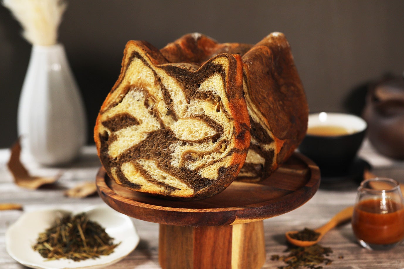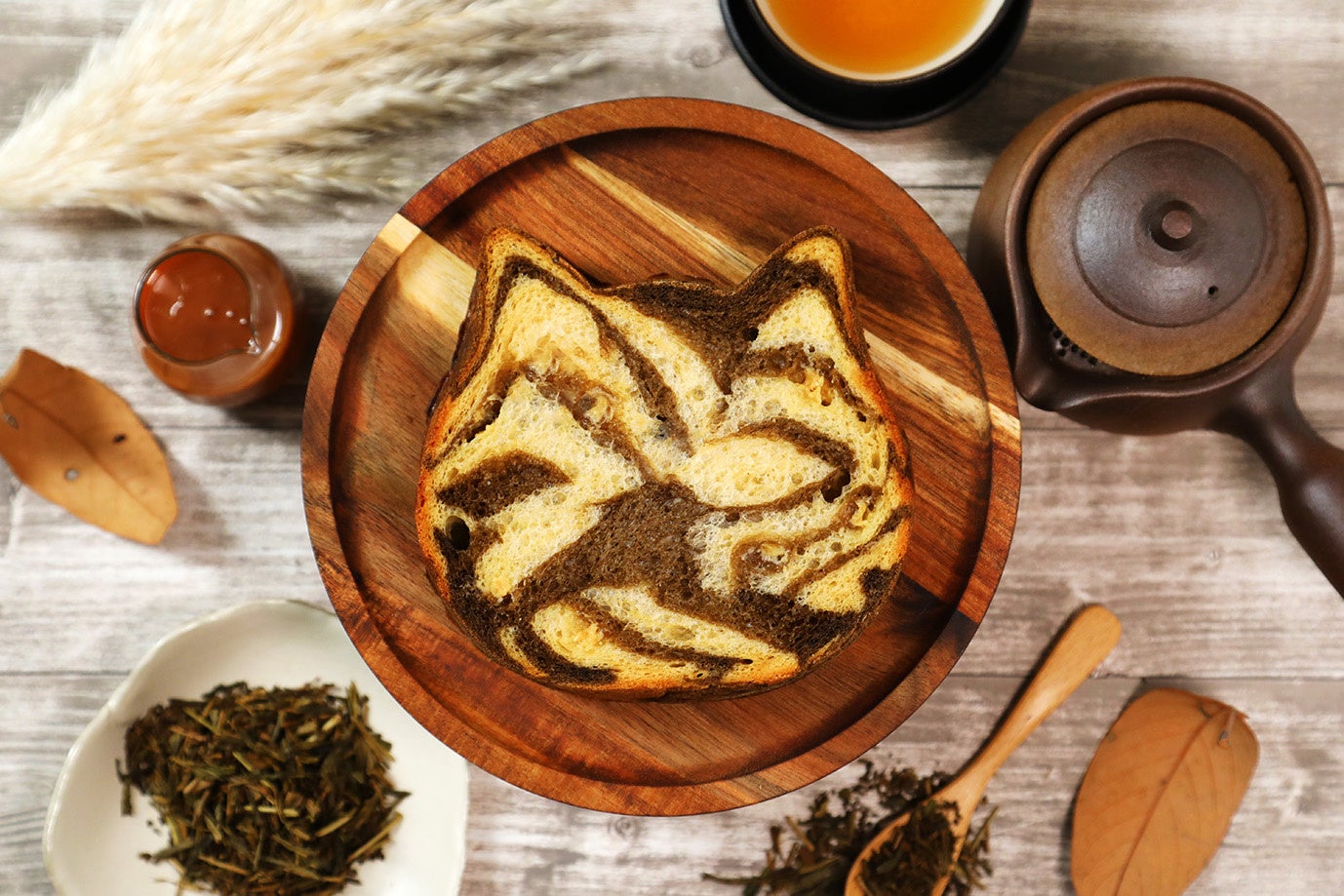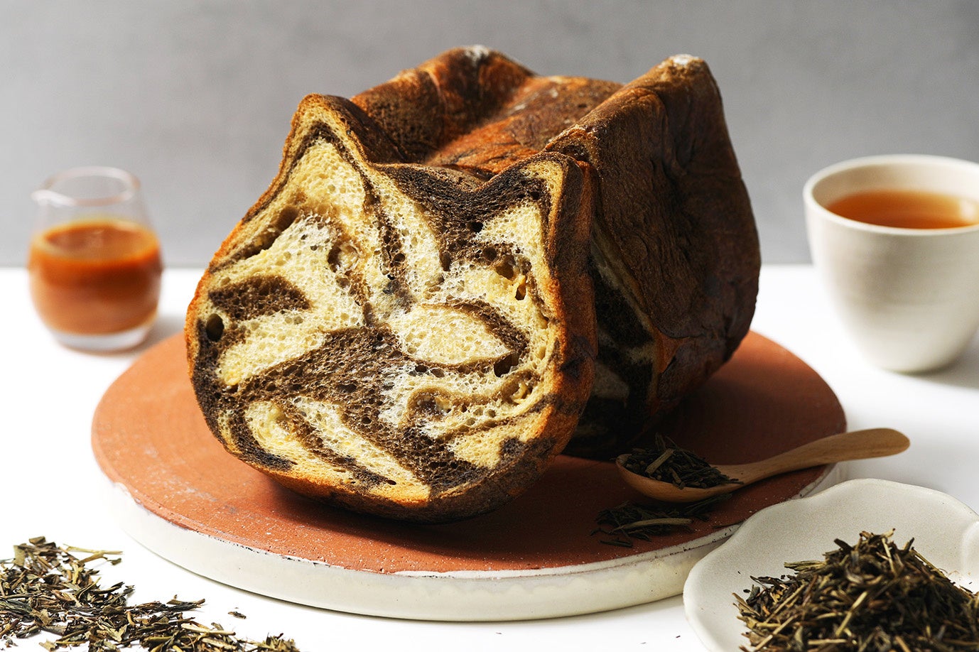 京都の宇治茶専門店「祇園辻󠄀利」のほうじ茶を練り込んだ生地とホワイトチョコを練り込んだキャラメル生地を重ねて焼き上げた、“茶トラねこ”をイメージしたねこねこ食パンです。