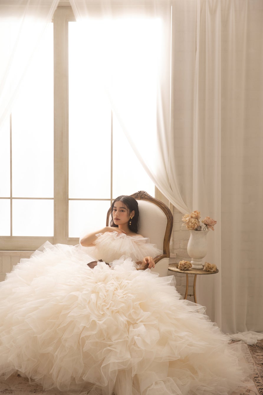着用ドレスは今全国の花嫁様から注目を集めている『SACHIKO TSUTSUI』で、その中でも話題の、チュールフリルのボリューム感がインパクトのある大人なロマンティックドレス。