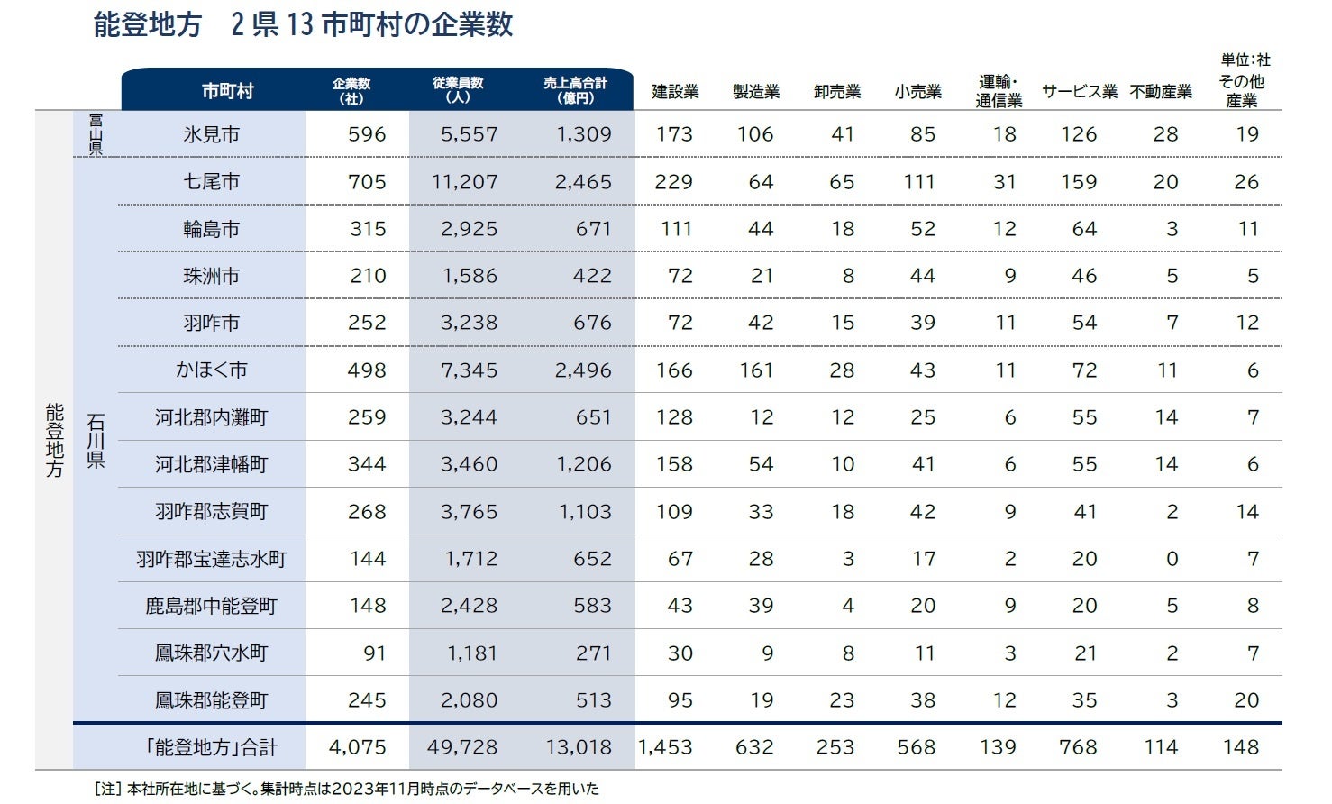 [注] 調査対象としたのは、「能登地方」に本社を置く企業(個人事業を含む)。なお、能登地方の定義は半島振興法に基づく。いずれも2023年11月末時点のデータを参照した