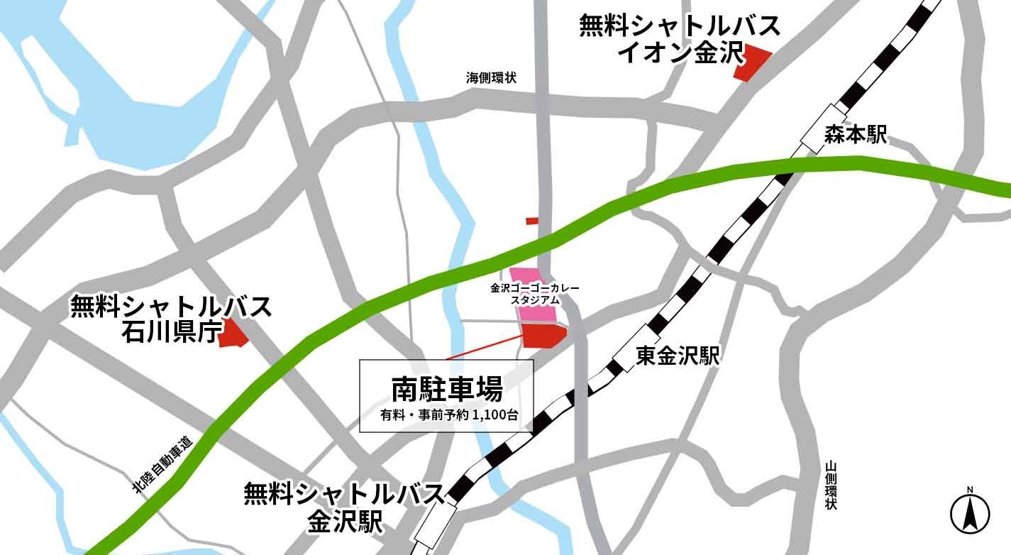 スタジアム周辺の交通渋滞緩和と環境負荷の軽減のため、マイカーから無料のスタジアム直行のシャトルバスに乗り換えてご来場いただくための駐車場(パーク・アンド・ライド駐車場)を石川県庁及びイオン金沢に設置しています。マイカー駐車のための料金も発生しませんので、ぜひご活用ください。