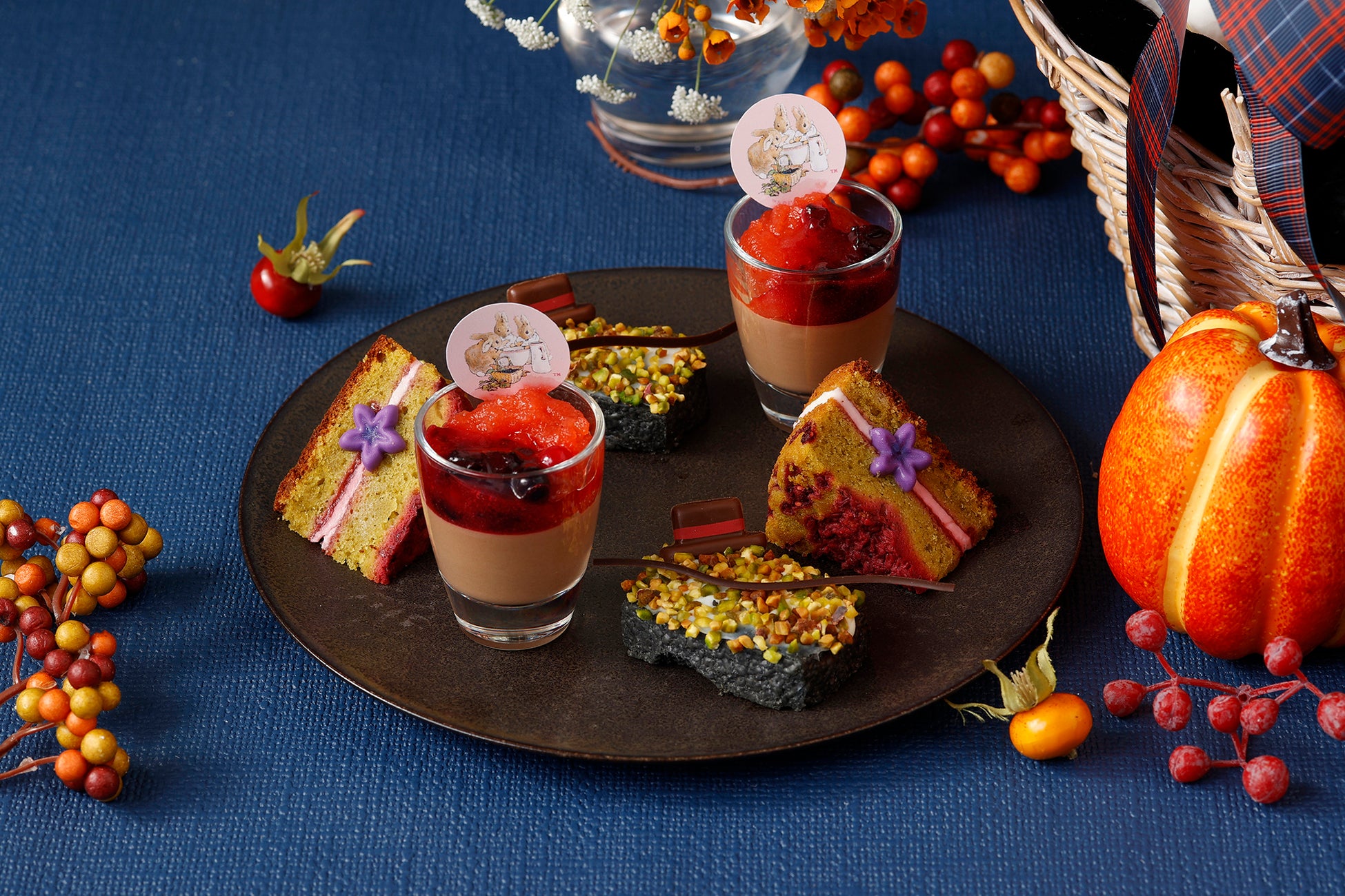 スイーツには、ティミーのふわふわのしっぽをイメージしたココナッツを纏わせたスパイス香るキャロットケーキや、イギリスで長く親しまれているビクトリアケーキにピスタチオを加えてリビーの洋服カラーにアレンジしたケーキ、チョコレートムースの上にジンジャーが効いたストロベリージュレとピーターの妹たちが収穫したベリーをトッピングしたベリーヌ、ジョニーのしっぽと帽子をイメージしたチョコレートを飾ったチーズ味のショートブレット、ベンジャミンが被っている帽子とハンカチを表現したピスタチオムースの5種をラインナップ。