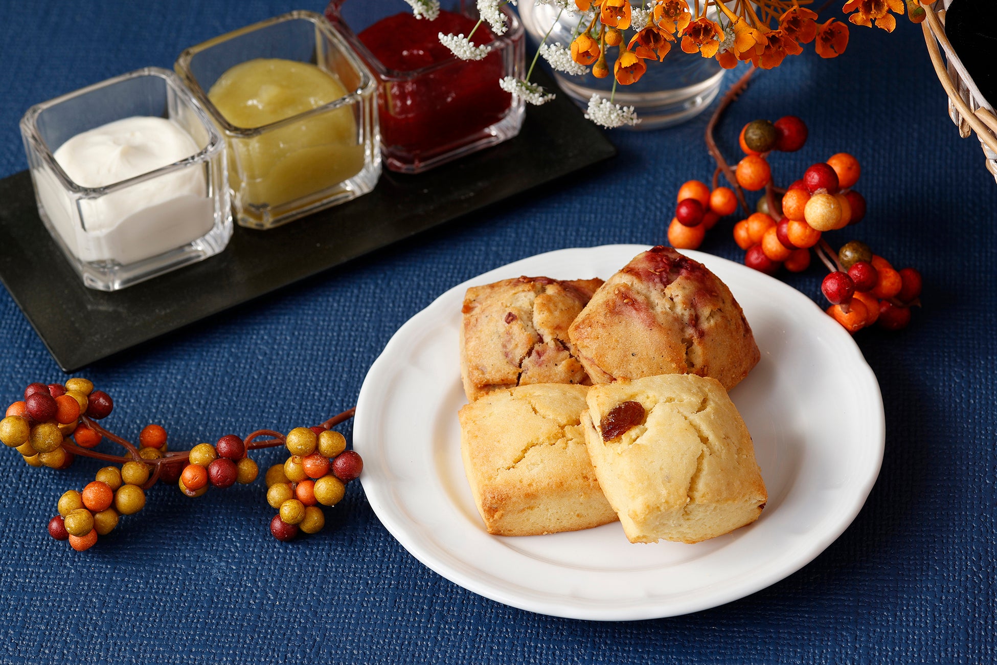 英国式アフタヌーンティーに欠かせないスコーンは、マロンと紅茶の2種類をご用意。クロテッドクリームとりんごジャム、ラズベリージャムを添え、焼きたてで提供いたします。本アフタヌーンティーの提供期間限定でご用意する、イギリスで長く愛される老舗ブランド「ウィッタード」の紅茶とともにお召し上がりいただくのもおすすめです。