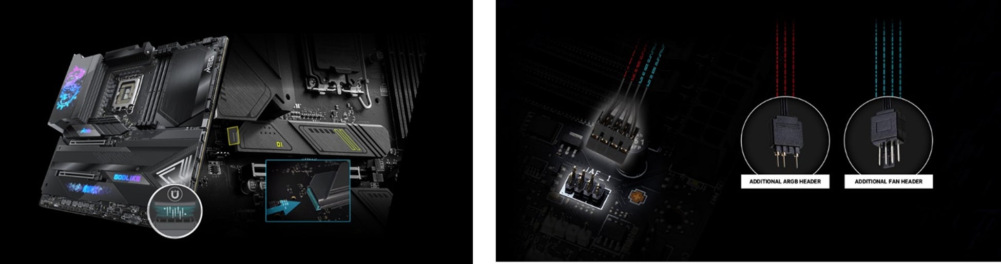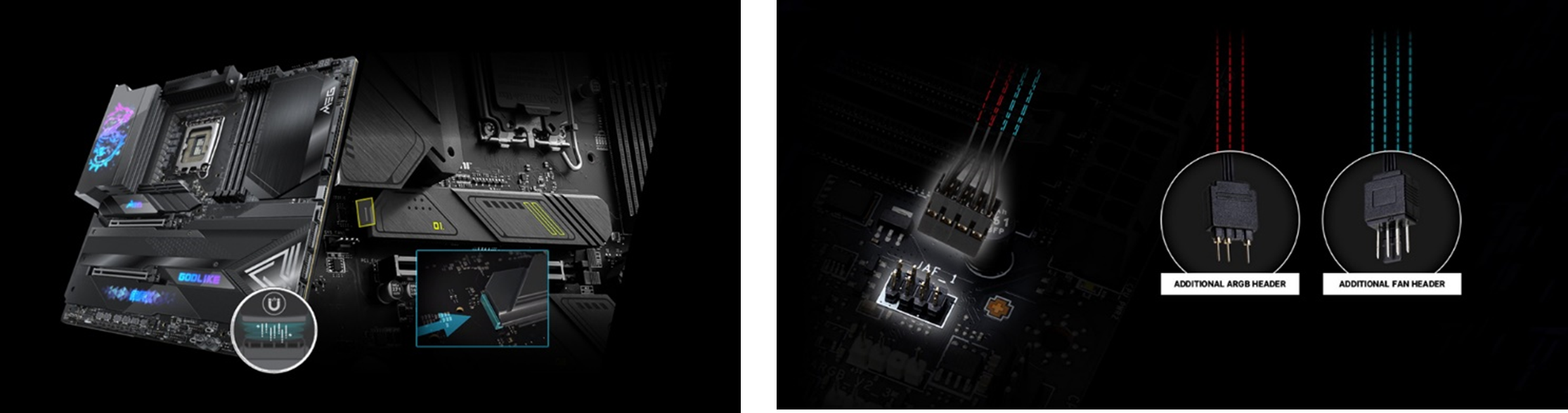 また、MEGおよびMPG Z790 MAXマザーボードは、本シリーズで初導入となるJAF1ヘッダーを搭載しています。このピンヘッダーは、付属の分岐ケーブル1本でARGBおよびファンヘッダーを追加することができます。