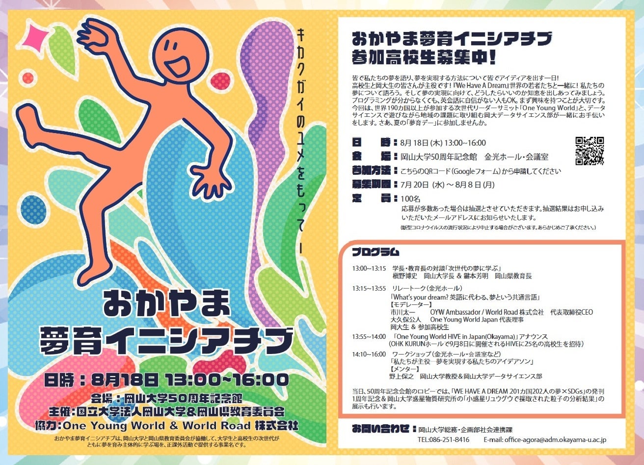 今回は、世界190カ国以上が参加する次世代リーダーサミット「One Young World」と、データサイエンスで遊びながら地域の課題に取り組む岡大データサイエンス部が一緒にお手伝いをします。 さあ、夏の「夢育デー」に参加しませんか。