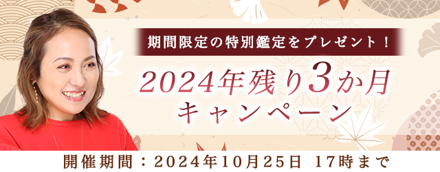 『2024年残り3か月キャンペーン』では、あなたが2024年を幸せに締めくくり気持ちよく新年のスタートを切れるよう、今一番占っていただきたい2024年残り3か月の鑑定と、当サイトの人気鑑定を厳選してご用意しました。キャンペーン期間中、こちらの対象鑑定を占っていただくと、期間限定の特別鑑定をプレゼント!ぜひ、この機会に大串ノリコの占いをお楽しみください。