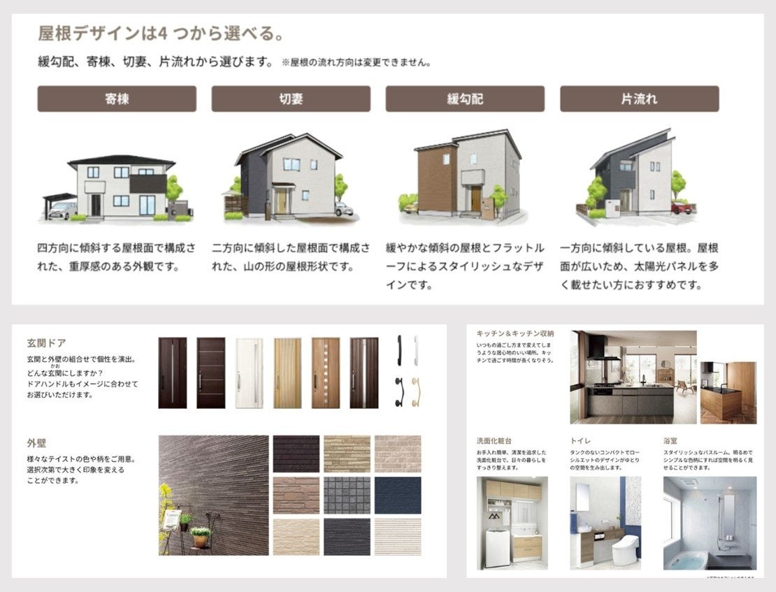 住まいの個性を引き立てる外装デザインと、日々の暮らしを快適にする水回り設備を備えた、理想の住まいを実現します。お好みに合わせて選べる外装は、住む人の個性を彩り、見るたびに満足感を感じられる仕上がりに。毎日の使いやすさと清潔さを保つ水回り設備が、心地よい暮らしをサポートします。
