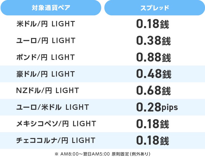本日よりLIGHTペアのスプレッドがLIGHT FX史上最狭で下記の通り、原則固定での配信となりました。