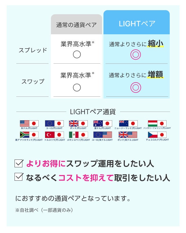 LIGHTペアは、通常の通貨ペアと比較して、さらにスプレッドが縮小され、受け取りスワップポイントさらに増額されるまさにトレードに特化した通貨ペアです。