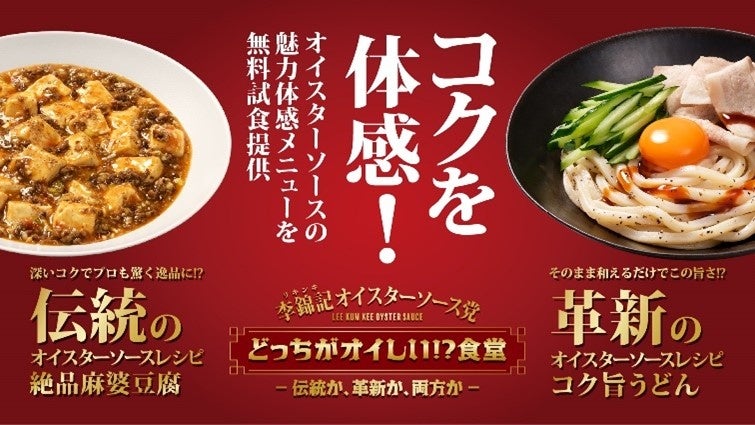 オイスターソースを使用した伝統派「絶品麻婆豆腐」と革新派「コク旨うどん」の2つのメニューをご試食いただけます。オイスターソースを隠し味に入れることでコクが増した、“オイしい”メニューを提供します。「絶品麻婆豆腐」と「コク旨うどん」のレシピは、特設サイト上で公開中です。オイスターソースの旨みとコクがたっぷりのメニューをご家庭でもお楽しみください。