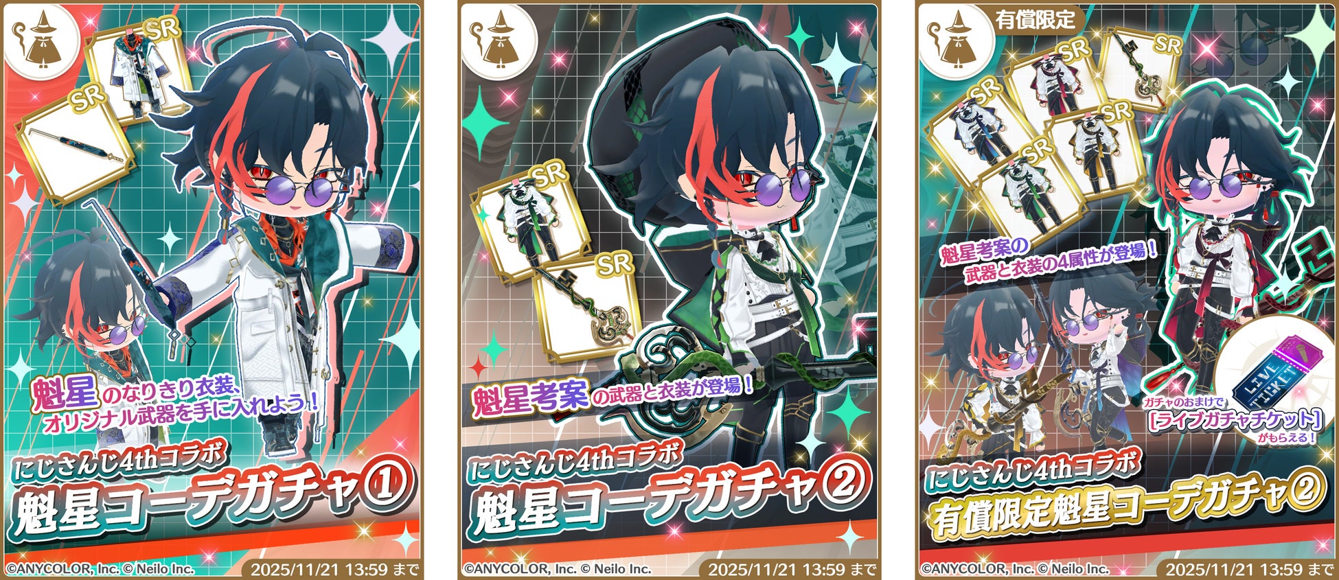 北見遊征、魁星、榊ネスがそれぞれ考案した武器や衣装の「4属性」が登場する【有償限定】のコーデガチャも要チェック。ガチャのおまけでもらえるライブガチャチケットも活用しよう。