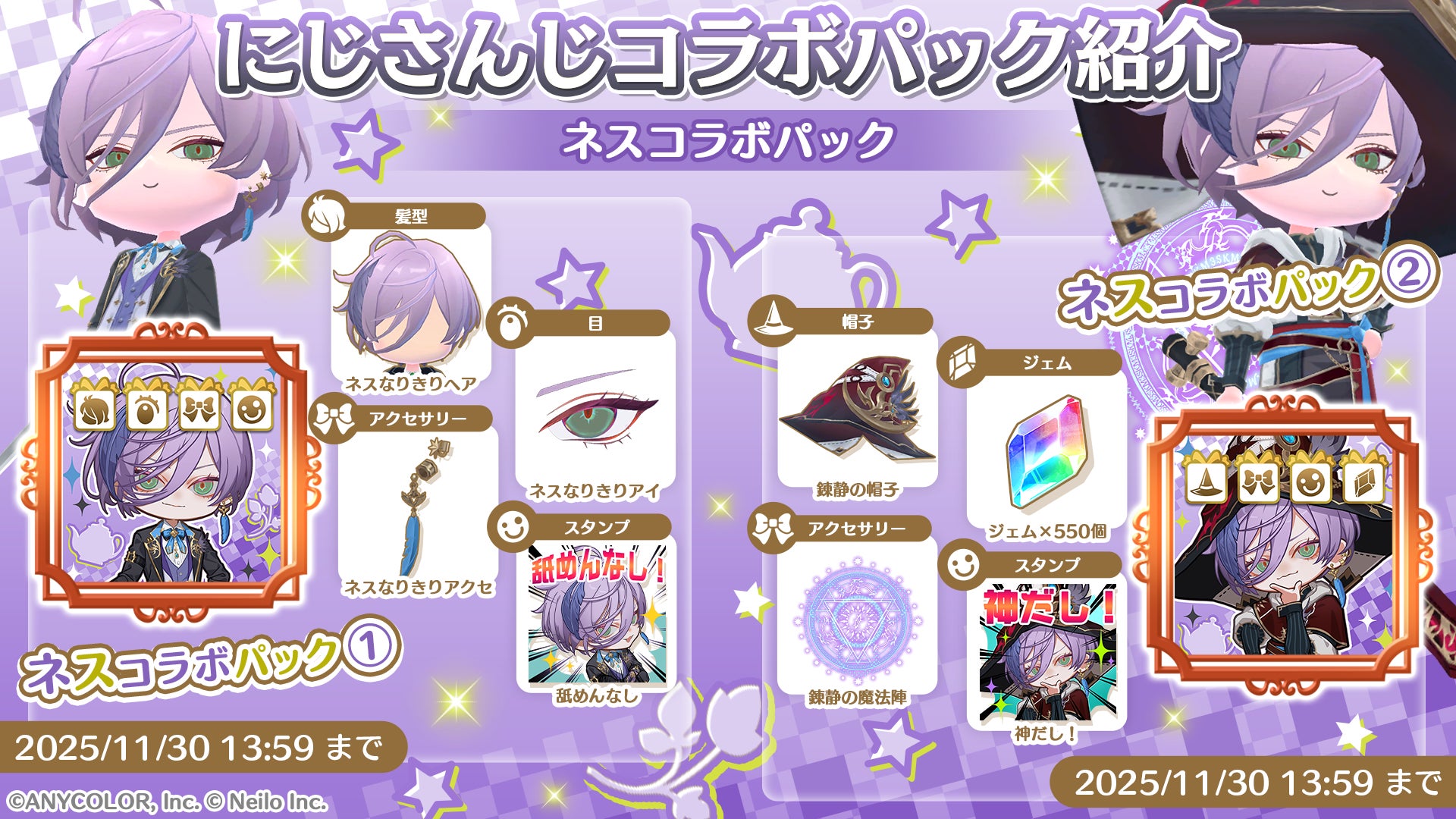 北見遊征、魁星、榊ネスになりきれる髪型や目パーツ、アクセサリーやオリジナルスタンプなどが手に入る期間限定パックが登場!パック①と②では内容が変わりますのでお楽しみに。