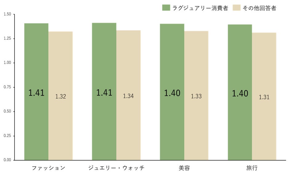 サステナブル消費として上乗せを許容できる金額に関する設問を「美容」、「ファッション」、「ジュエリー・ウォッチ」、「旅行」の各4カテゴリーで聴取し、それぞれの平均倍率を算出しました。その結果、「ラグジュアリー消費者」のサステナブルな商品への⽀出許容額は平均1.4倍で、カテゴリに関わらず⼀定していることがわかりました。本調査レポート(有料版)においては、各カテゴリにおける詳細を掲載しています。