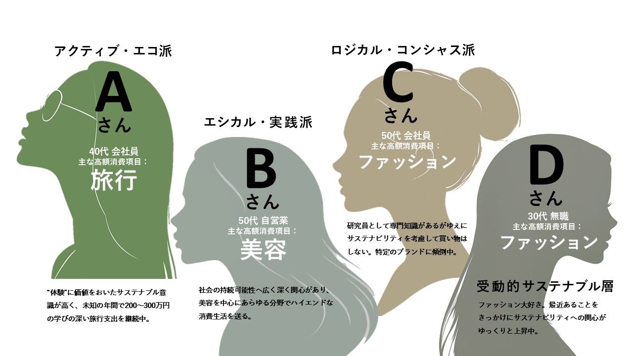 今回の分析対象者から、居住地や年代、主な消費項⽬が異なる4⼈の「ラグジュアリー消費者」を選出し、それぞれの方との対話をもとに、サステナビリティへの関与の実情を明らかにし考察を加えています。